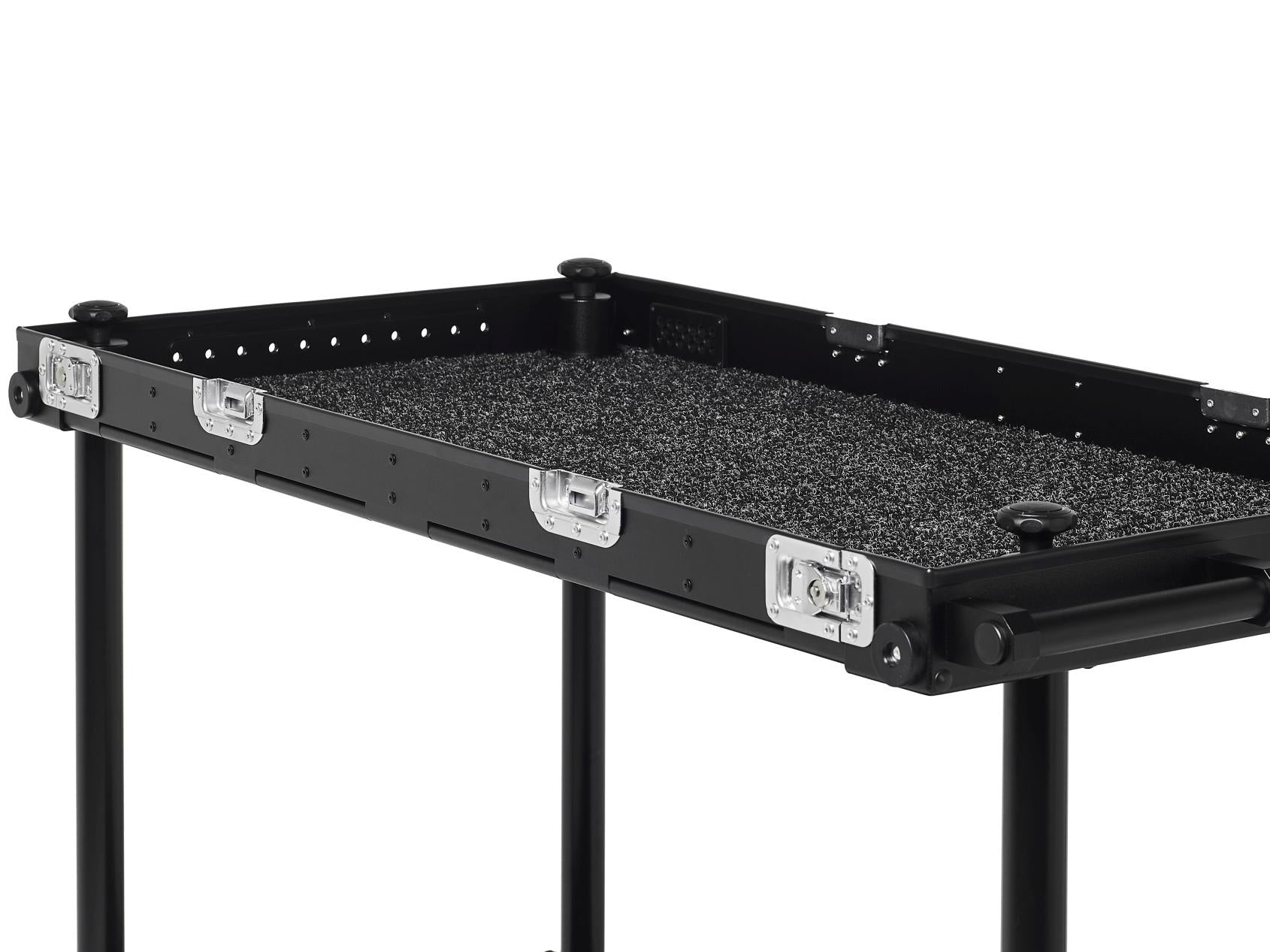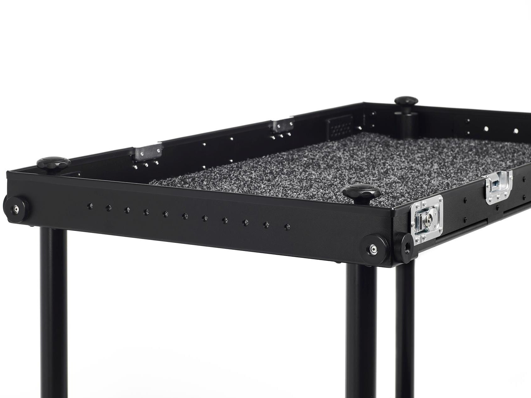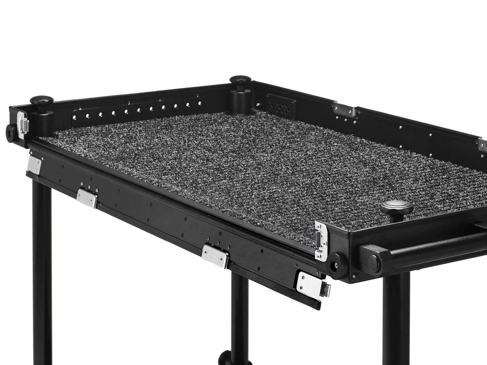 Marginea platformei superioare a cartului MAX+ poate fi pliata. Deschiderea este extrem de rapida, iar aceasta solutie garanteaza extensia zonei de lucru si un confort crescut atunci cand se lucreaza la o tastatura sau la o suprafata de control. Gaurile cu filet de diferse dimensiuni de pe partile laterale permit o flexibilitate maxima in adaugarea de accesorii dedicate productiilor video.