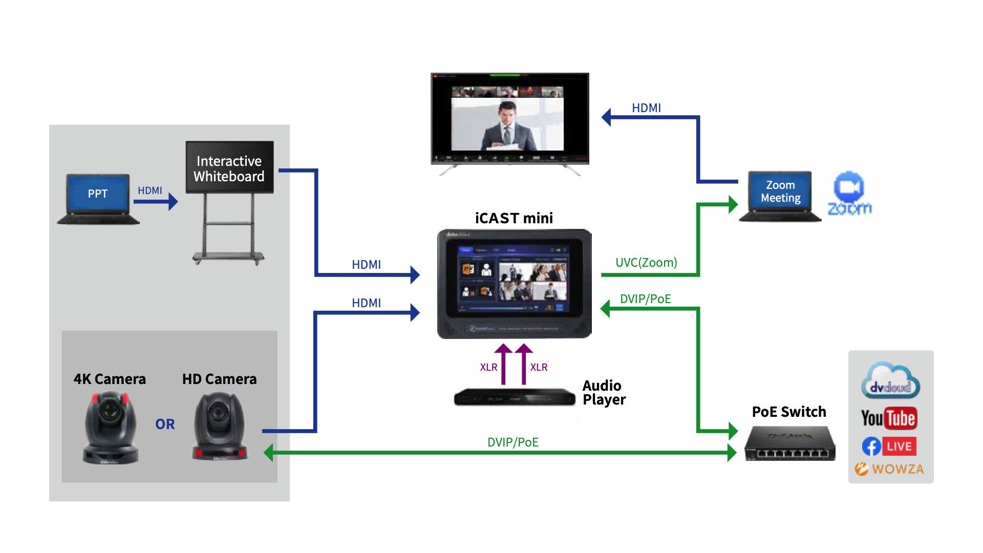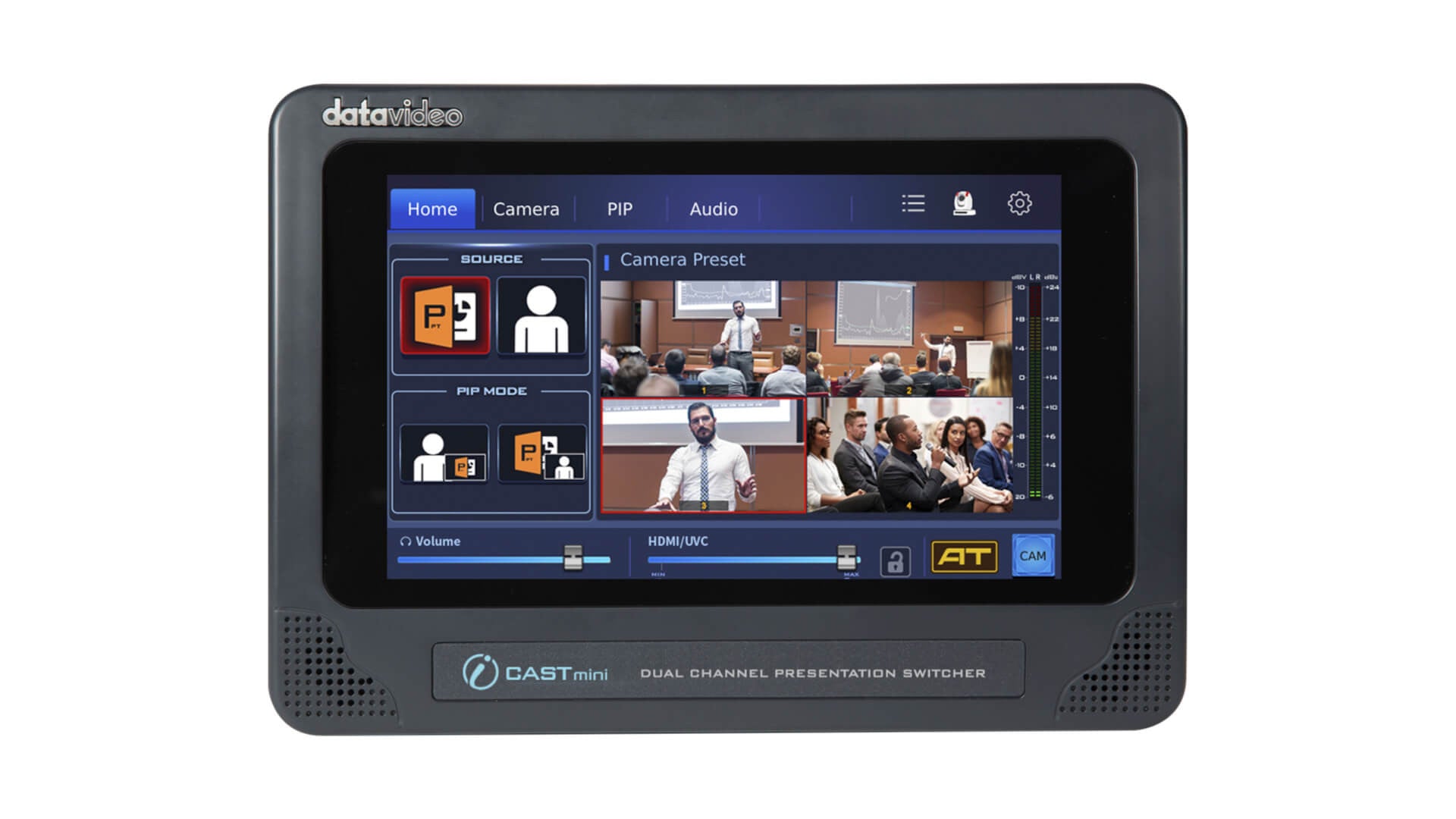 Nu trebuie să înveți tehnologii complicate despre producția video sau să angajezi o echipă de producție profesionistă. Puteți prelua controlul asupra propriilor prezentări cu iCAST mini. Pur și simplu conectați alimentarea și sursele video, apoi lăsați restul în sarcina iCAST mini.